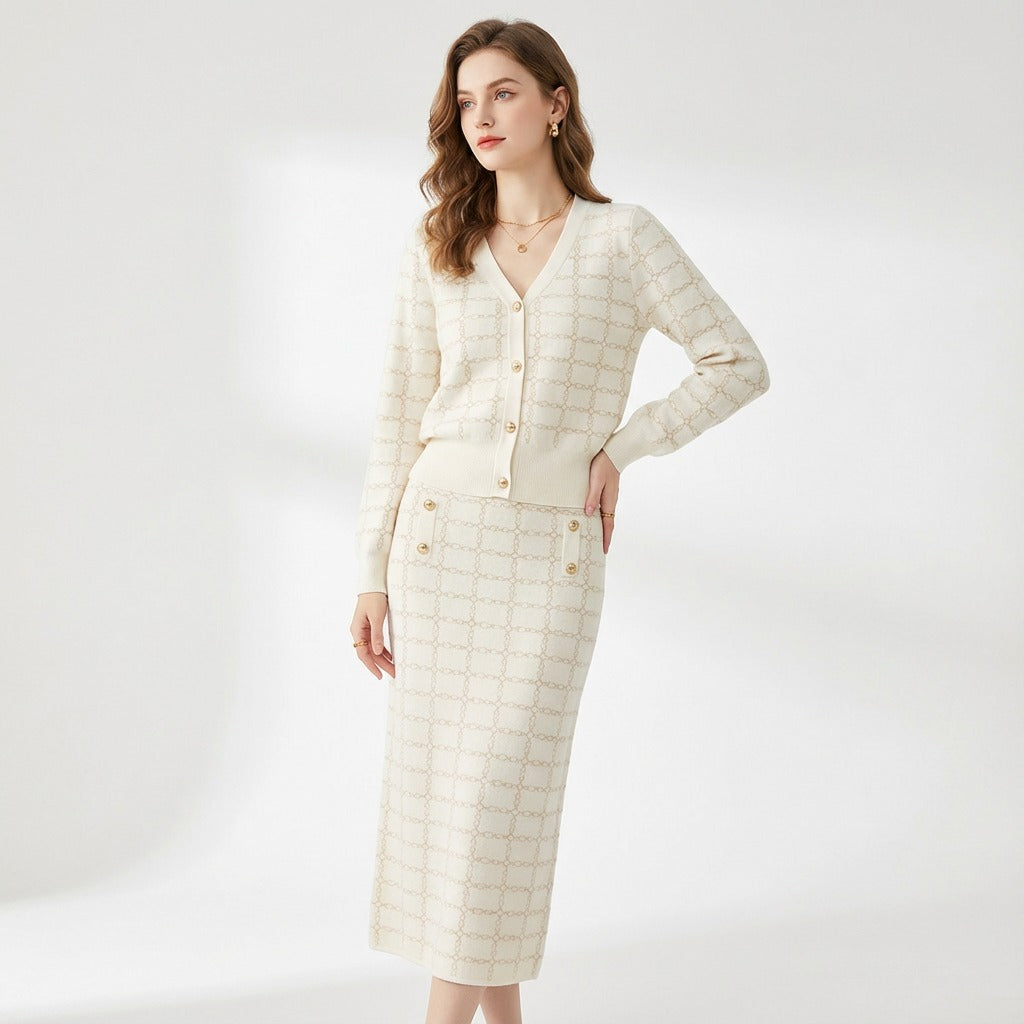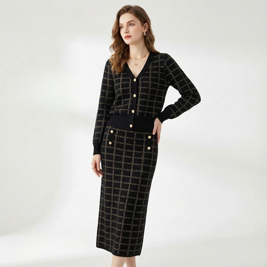 Productbeschrijving:Deze stijlvolle combinatie bestaat uit een trui en een lange kokerrok die de elegantie van de vrouw benadrukt. Verkrijgbaar in twee kleuren, ideaal voor vergaderingen, zakelijke diners of speciale gelegenheden. De trui heeft knopen en een rechte snit – een toonbeeld van verfij...